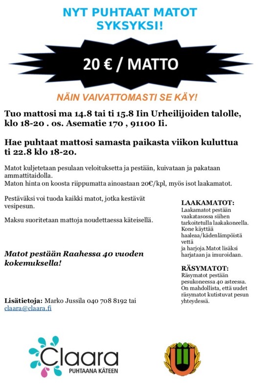 Tuo mattosi ma 14.8 tai ti 15.8 Iin Urheilijoiden talolle, klo 18-20 . os. Asematie 170 , 91100 Ii. HUOM! AIKATAULUMUUTOS! Hae puhtaat mattosi samasta paikasta ti 29.8 klo 18-20.