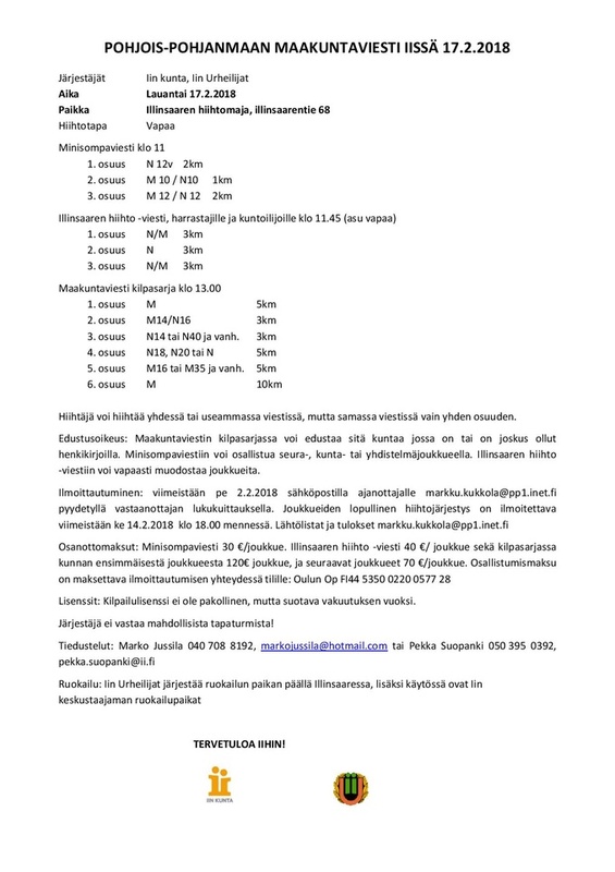 ILLINSAAREN HIIHTO -VIESTI KLO 11.45 Taivalkoski Pudasjärvi Haukipudas Meranti Iin Hiihtoseura Iin kunta, tekniset palvelut Kuusamon Eräveikot 1 Kuusamon Eräveikot 2 |