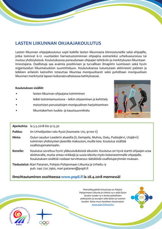Ilmoittautuminen la 28.4.2018 mennessä! Pohjois-Pohjanmaan Liikunta ja Urheilu ry järjestää la 5.5.2018 klo 9-15.30 Lasten liikunnan ohjaajakoulutuksen Iin Urheilijoiden talolla Iissä. Lisätietoa oheisesta linkistä http://www.popli.fi/lastenliikunta/koulutukset/kerho-ohjaajille/lasten-liikunnan-ohjaajakoulutus/ |
