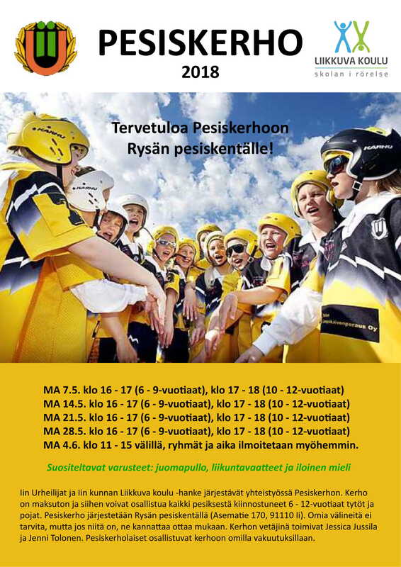 Iin Urheilijat ja Iin kunnan Liikkuva koulu -hanke järjestävät yhteistyössä Pesiskerhon. Kerho on maksuton ja siihen voivat osallistua kaikki pesiksestä kiinnostuneet 6 - 12-vuotiaat tytöt ja pojat. Pesiskerho järjestetään Rysän pesiskentällä (Asematie 170, 91110 Ii). Omia välineitä ei tarvita, mutta jos niitä on, ne kannattaa ottaa mukaan. Kerhon vetäjinä toimivat Jessica Jussila ja Jenni Tolonen. Pesiskerholaiset osallistuvat kerhoon omilla vakuutuksillaan. Ilmoittautuminen paikan päällä. Tervetuloa! Aikataulu: Maanantaisin 7.5.-28.5.2018 klo 16 - 17 (6-9-vuotiaat), |