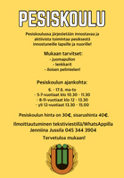 Pesiskoulun hinta on 30 €, sisarushinta 40 €. Pesiskouluun voi ilmoittautua tekstiviestillä/WhatsAppilla numeroon 045 344 3904 / Jenniina Jussila. |